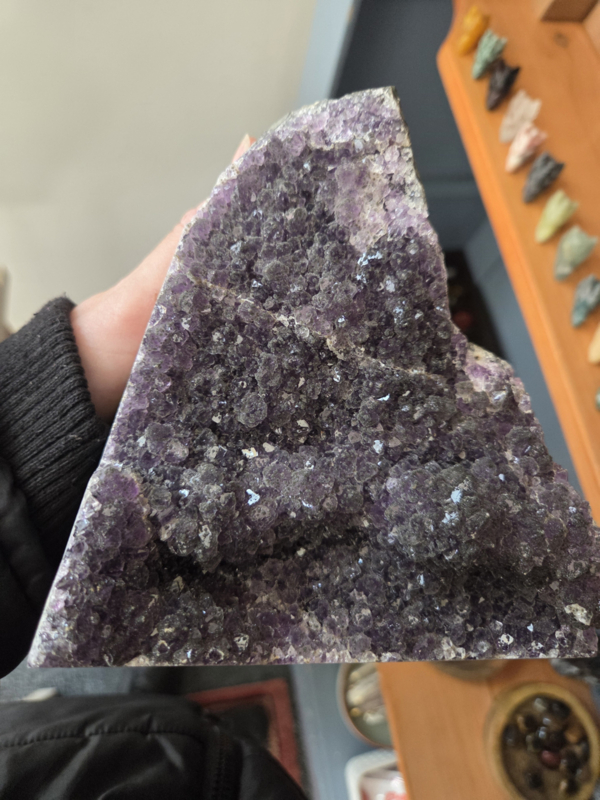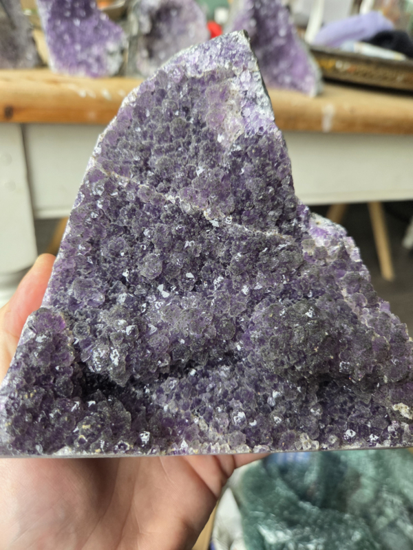 Ontdek de ongeëvenaarde schoonheid van de amethist uit Uruguay, wereldwijd geliefd om zijn intens dieppaarse kleur en hoogwaardige kwaliteit. In tegenstelling tot de vaak lichtere varianten uit Brazilië, kenmerken deze kristallen zich door hun rijke, bijna koninklijke tinten en kleinere, sprankelende kristalpunten die prachtig glanzen in het licht.