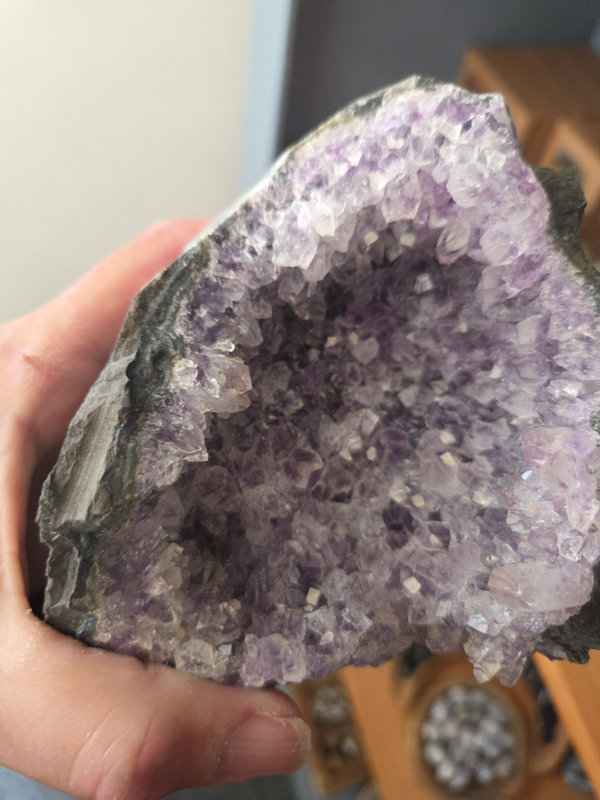 Ontdek de ongeëvenaarde schoonheid van de amethist uit Uruguay, wereldwijd geliefd om zijn intens dieppaarse kleur en hoogwaardige kwaliteit. In tegenstelling tot de vaak lichtere varianten uit Brazilië, kenmerken deze kristallen zich door hun rijke, bijna koninklijke tinten en kleinere, sprankelende kristalpunten die prachtig glanzen in het licht.